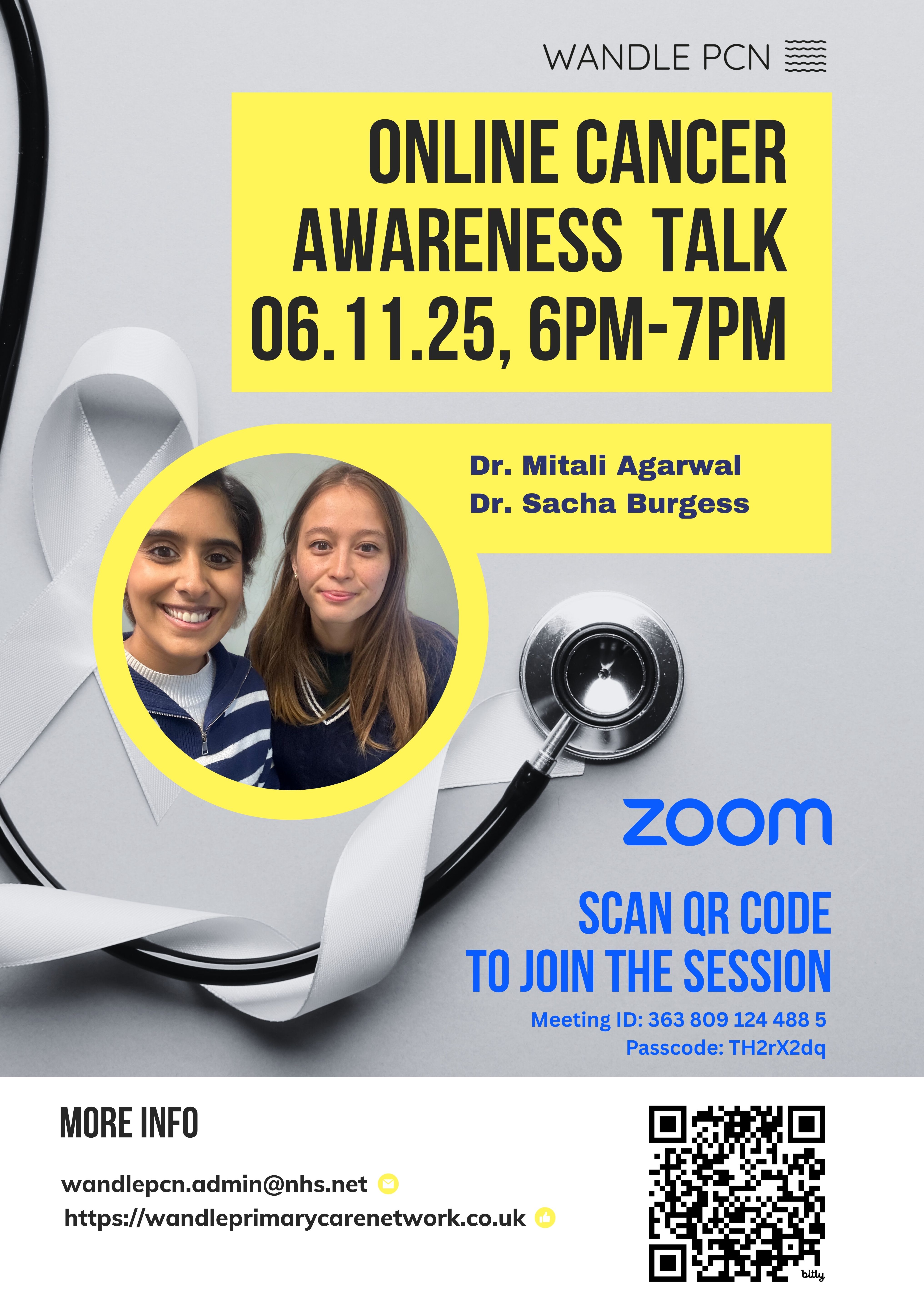 Join Dr Mitali Agarwal and Dr Sacha Burgess on Thursday, 6th November at 18:00 for the online Cancer Awareness Talk.